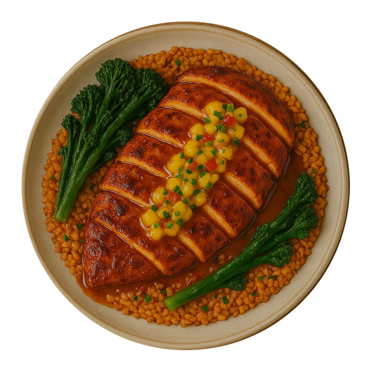 Juicy Cajun-spiced chicken breast served over fragrant Aleppo chilli and coriander rice, with smoky charred greens and a zesty pineapple & chilli salsa. A perfect balance of heat, freshness, and sweet-spicy kick — bold flavour in every bite.