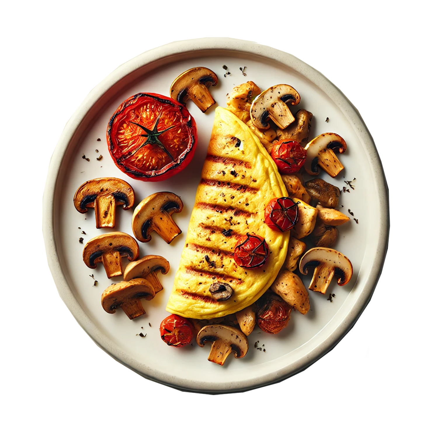 Start your day with our delicious Chicken and Mushroom Omelette, a light yet satisfying dish made with tender, seasoned chicken and earthy mushrooms, all enveloped in a fluffy, perfectly cooked omelette. Paired with juicy, grilled tomatoes for a burst of freshness, this meal offers a balanced combination of protein, flavour, and nutrition.