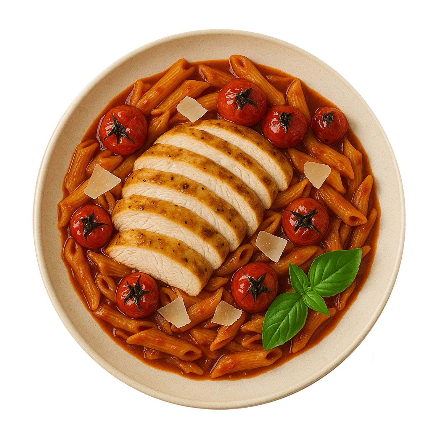 Garlic Chicken Breast, Tomato & Basil Pasta, Balsamic Roasted Cherry Tomatoes, Parmesan Cheese