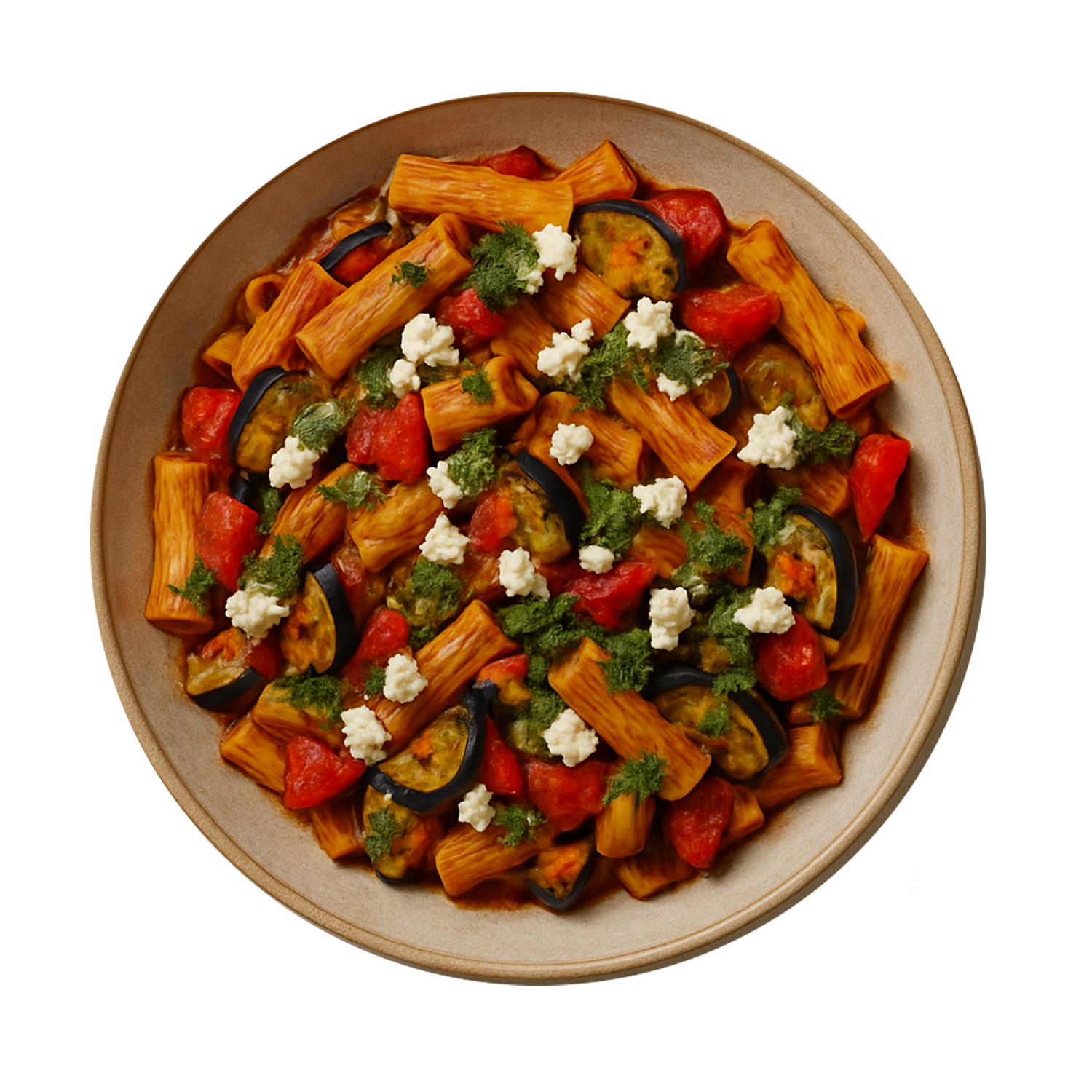 A hearty mix of roasted Mediterranean vegetables and pasta baked in a rich tomato sauce, topped with creamy crumbled feta cheese and finished with a drizzle of fragrant basil pesto. A comforting, flavour-packed dish with a fresh and vibrant finish.